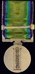 The Great East Asia War Medal (大東亜戦争従軍記章, Daitōa sensō jūgun kishō) was created on June 21, 1944 by Imperial Edict No. 417.[12] Because of the late date in the war it appears none were actually awarded to veterans. However many later replicas exist.[13]
