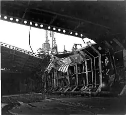Katsuragi survived the war without sustaining any further damage, and was designated as a Special Transfer Ship on 2 October and then assigned to repatriation duty on 13 October after the necessary repairs were made. Her crew at this time consisted only of 12 officers, one warrant officer, and 40 petty officers and crewmen, with Captain Miyazaki still in command.[13] The damage from the July attack was only repaired enough to allow the hangar deck to house some 5,000 returning soldiers and civilians and the ship began her first voyage outside Japanese waters on 19 December. On this first voyage, she called upon Minamidaitojima, Rabaul and Australia. Upon her return, further repairs were necessary to make her rain-tight. These were completed by 15 January 1946 and she made a number of trips in early 1946 to bring back Japanese nationals.[Note 2] before being placed on standby in April.[13] Katsuragi was stricken from the Navy List on 15 November and transferred to the Home Ministry for disposal five days later. Scrapping of the ship began on 22 December 1946 at the Hitachi Zosen facility in Osaka-Sakurajima and was completed on 30 November 1947.[14]
