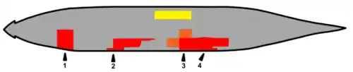 Four torpedoes struck Shinano, at an average depth of 4.3 meters (14 ft).[27] The first hit towards the stern, flooding refrigerated storage compartments and one of the empty aviation gasoline storage tanks and killing many of the sleeping engineering personnel in the compartments above. The second hit the compartment where the starboard outboard propeller shaft entered the hull and flooded the outboard engine room. The third hit further forward, flooding the No. 3 boiler room and killing every man on watch. Structural failures caused the two adjacent boiler rooms to flood as well. The fourth flooded the starboard air compressor room, adjacent anti-aircraft gun magazines, and the No. 2 damage control station and ruptured the adjacent oil tank.[32]