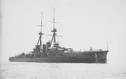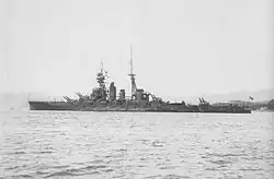 Hiei was the second of the Imperial Japanese Navy's Kongō-class battlecruisers, a line of capital ships designed by the British naval architect George Thurston.[2] The class was ordered in 1910 in the Japanese Emergency Naval Expansion Bill after the commissioning of HMS Invincible in 1908.[3] The four battlecruisers of the Kongō class were designed to match the naval capabilities of the other major powers at the time; they have been called the battlecruiser versions of the British (formerly Turkish) battleship HMS Erin.[1][4] With their heavy armament and armor protection (the latter of which made up 23.3% of their approximately 30,000 ton displacement),[1] Hiei and her sister ships were vastly superior to any other Japanese capital ship afloat at the time.[4]