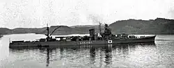 Operation Crossroads began with the first blast (Test Able), an air burst on 1 July; Sakawa was filled with cages containing various animals to be tested for radiation effects. Ground zero was 450 meters (490 yd) above and slightly to starboard of Sakawa's stern. The blast set the ship afire[9] and its force crushed her superstructure aft of her bridge, damaged her hull and she began taking on water. After the test, Sakawa was slightly down by the stern and had a slight list to port. The flooding progressively worsened overnight and the following morning saw her even more settled by the stern and with a greater list.[10] The tug boat USS Achomawi tried to beach the cruiser to prevent her from sinking, but failed as Sakawa started sinking by the stern almost as soon as towing began. Achomawi had to cut the tow cable to prevent herself from being dragged under.[9] Sakawa sank at 11°37′N 165°29′E / 11.617°N 165.483°E in about 200 feet (61 m) of water.[11]