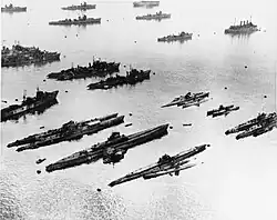 On 7 November 1944, the commander-in-chief of the Combined Fleet, Admiral Soemu Toyoda, and the commander of the 6th Fleet, Vice Admiral Shigeyoshi Miwa, visited Otsujima to see off the kaiten pilots.[4] On 8 November 1944, the Kikusui-tai Kaiten Group — made up of I-47 and the submarines I-36 and I-37 — got underway from Otsujima to conduct the first kaiten operation.[4] Plans called for I-37 to target an American fleet anchorage at Palau with kaitens, while I-36 and I-47 were to carry out a kaiten attack on the U.S. anchorage at Ulithi Atoll in the Caroline Islands, then proceed to Leyte Gulf to attack Allied ships with conventional torpedoes.[4] On 16 November 1944, the submarines received a report from a Nakajima C6N1 Saiun ("Iridescent Cloud"; Allied reporting name "Myrt") reconnaissance aircraft which made a high-altitude flight over Ulithi Atoll and sighted four fleet aircraft carriers and three battleships as well as cruisers and destroyers in the north central part of the lagoon and transports, oilers, and other ships in the south-central part.[4]
