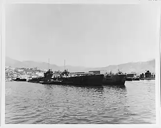 After arriving at Kure on 1 April 1945, I-53 entered drydock for repairs.[4] In addition, her forward 140-millimeter (5.5 in) deck gun was removed to make room for fittings on her forward deck allowing her to carry two more kaitens, giving her a maximum kaiten-carrying capability of six.[4] Shipyard workers also equipped her with a snorkel and fitted underwater access tubes for all six of her kaitens so that their pilots could man them while she was submerged.[4] With the work complete, she departed Kure on 9 July 1945 bound for Otsujima and carried out combat exercises during her voyage.[4] She arrived at Otsujima on 13 July 1945.[4]