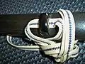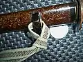 A sageo (下緒 or 下げ緒) is a hanging cord made of silk, cotton or leather that is passed through the hole in the kurigata (栗形) of a Japanese sword's saya. There are a number of different methods for wrapping and tying the sageo on the saya for display purposes. Other uses for the sageo are tying the sword to the samurai and hojojutsu. The samurai felt the sageo formed a spiritual bond between them and the sword, and they were very particular about tying it correctly when the sword was not in use.[15]