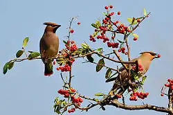Unlike Bohemian waxwing, the row of red tips on the secondary feathers of the wing (which give the birds their name) are only present in males; they also lack the 'teardrop' shape of that species.[3] Japanese waxwings often occur in mixed flocks with Bohemian waxwings which, as well as usually having more prominent waxy tips, are slightly larger, and with a yellow tail-tip, greyish centre to the belly and no reddish-brown bar on the wing.