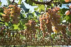 Japan supports a wide range of grape varieties although the vast majority of this production is for table consumption and only a small percentage is used in domestic wine making. Strictly speaking there are no vines native to Japan,[14] although the Koshu white wine grape has evolved locally over many centuries and is therefore considered an indigenous variety.[15] Hardy varietals imported from North America such as the Delaware and Niagara grape were widely planted in the post war period, but since 1985 have significantly declined in popularity.[16] Premium table consumption grapes such as Kyoho and more recently Pione, a hybrid cultivar of Kyoho and Cannon Hall Muscat, command significant price premiums for producers.