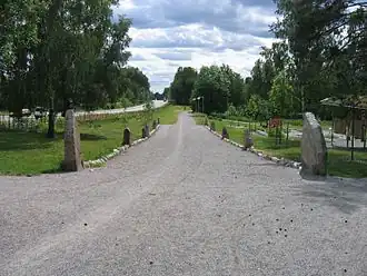 The so-called Jarlabanke's bridge is a causeway in Täby which was originally bordered by four runestones and many raised stones.[4] It is c. 116 metres long and 6.4 metres wide, and there were inscriptions (U 164 and U 165) by Jarlabanke both at the southern and the northern end of the causeway.[5] One of the runestones was moved during his lifetime to the location of the local assembly of the Vallentuna Hundred, where it received a new text and it was replaced with a new fifth one at Jarlabanke's bridge and which had a different design.[4]