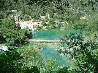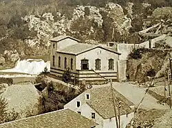 The Krka Electric Power Plant (full name in Croatian: Prva povlaštena električna centrala u Dalmaciji "Krka" Ante Šupuk i sin), later named Jaruga 1, was the first plant built on the river.[7] In December 1892, Vjekoslav Meichsner received a permit to build a new house on the Krka, intending to construct a hydroelectric power plant (HPP) within it. He was granted a concession for water use from the river in December 1893 and in June 1895 founded a company with the mayor of Šibenik Ante Šupuk and his son Marko. After sixteen months of construction,[8] the power plant and its 11.5 km (7.1 mi) long transmission line with distribution via 6 transformers began operation on 28 August 1895.[1]