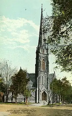 The present church was erected on Jarvis Street in 1875, with a large donation to the construction costs from the Canadian Senator and banker, William McMaster.[1] The newly formed Baptist Union of Canada held its first meeting at Jarvis Street in October 1880. In 1882, William McMaster, William Elliot (a member of Jarvis Street and a Toronto pharmacist and businessman),[2] and others established the Standard Publishing Company, which published the Canadian Baptist, transferring that enterprise from private ownership to a denominational enterprise.