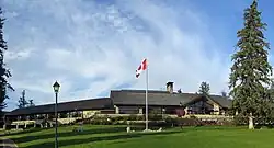 The wide-open valley along Lac Beauvert made the prospect of a golf course in the area feasible, and in 1922 the Dominion Parks Branch decided to build a golf course for use by visitors and Jasper residents.[36] A simple nine-hole course was designed by Charlie Duncan, a golf professional from Banff, and work began on clearing boulders and bush.[36] After slow construction in 1922 and 1923, the Canadian National Railway approached the Canadian government with an offer to take over the construction of the golf course. The Canadian National Railway commissioned Canadian golf course architect Stanley Thompson to design the 18-hole course.[36][37] The 35-hectare (86-acre) site was cleared in the summer of 1923 by a team of 250 men, which found the topsoil insufficient for growing thick grass necessary for the course.[38][39] The Canadian National Railway bought a quarter-section of farm land near Edmonton, stripped the topsoil and loaded it into trains to Jasper at great expense to complete the golf course.[38][40] A 190,000-litre concrete dam was built along the mountainside to hold water for the course.[40] The Jasper Park Lodge Golf Club opened on July 17, 1925, with Douglas Haig, 1st Earl Haig, the commander in chief of British Forces in the First World War, hitting the first ball.[38][39] The course was renovated in 1928–29 in preparation for the Canadian Amateur Championship.[41] In 1930, a clubhouse was constructed for the course, as well as a 23-bedroom building for golfers.[18][41] The Jasper Park Lodge Golf Club held an annual "Totem Pole Tournament" from the 1920s to the 1950s, which was won by actor Bing Crosby in 1947.[42][43]