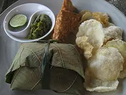 Pecel, a type of peanut sauce with chili[34] is a common ingredient in Javanese cuisine. It is used in various type of Rujak and Gado-gado. It can also be used as stand alone sauce with rice and prawn, egg and vegetables as Nasi Pecel (Pecel rice).[35]