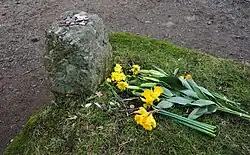 It is now said that the three local parishes of Widecombe-in-the-Moor, North Bovey and Manaton all refused to bury her body within consecrated ground, so she was buried at a crossroads, which was standard practice for suicide victims at the time.[1] It is also often said that this crossroads is at the point where the three parishes met,[14] though the Ordnance Survey map confirms that this is not the case.
