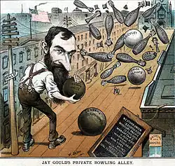 Due to the struggle to keep Cornelius Vanderbilt from taking over their interests in railroad, Gould and James Fisk engaged in financial manipulations.[16] In August 1869, Gould and Fisk conspired to begin to buy gold in an attempt to illegally corner the market. Gould used contacts with President Ulysses S. Grant's brother-in-law, Abel Corbin, to influence the president and his Secretary General, Horace Porter.[17][18] These speculations culminated in the financial panic of Black Friday on September 24, 1869,[19] when the greenback (cash) premium over face value of a gold double eagle fell from 62 percent to 35 percent. Gould made a small profit from that operation by hedging against his own attempted corner as it was about to collapse, but lost it in subsequent lawsuits. The gold corner established Gould's reputation in the press as an all-powerful figure who could drive the market up and down at will.[20] Favored by Tweed Ring judges, the conspiratorial partners escaped prosecution, but the months of economic turmoil that rocked the nation following the failed corner proved ruinous to farmers and bankrupted some of the most venerable financial institutions on Wall Street.