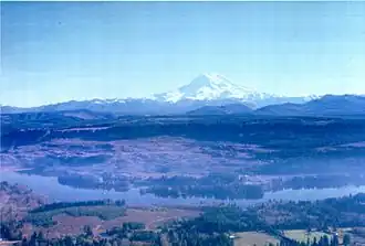 Lake Kapowsin /kəˈpaʊ.ə.sɪn/ is a lake in Pierce County, Washington, about halfway between Tacoma on Puget Sound, and Mount Rainier in the Cascade Mountains. The lake is 2.5 miles (4.0 km) long and 0.15–0.5 miles (0.24–0.80 km) wide, lying in a channel formed by meltwater from the Puget lobe of the Vashon glacier during the Pleistocene glaciation. A small island, Jaybird Island, lies in the northern half of the lake.[3] As indicated by a drowned forest in the lake and other evidence, the Puyallup River was inundated about 550 years ago by a lahar from Mount Rainier called the Electron Mudflow.[4] The mudflow partially filled the channel (leading to its shallow, smooth bottom today) and blocked Ohop Creek's outlet, forming present-day Lake Kapowsin.[1]: A69–A70
