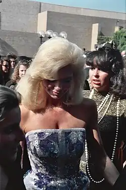 Mansfield's publicity antics are another recurring theme in popular culture.[1] On the season 32 episode of Saturday Night Live hosted by Alec Baldwin (with musical guest Christina Aguilera), one of the commercial bumpers has Alec Baldwin photoshopped into the famous picture of Sophia Loren staring at Mansfield's chest at Romanoff's in Beverly Hills. It was a direct reference to a publicity stunt of Mansfield in April 1957 intended to deflect attention from Loren during a dinner party in the Italian star's honor. Photographs of the encounter were published around the world. The most famous image showed Loren raising a contemptuous eyebrow at the American actress who, sitting between Loren and her dinner companion, Clifton Webb, had leaned over the table, allowing her breasts to spill over her low neckline and exposing one nipple.[17] The photo of Sophia Loren sitting next to Jayne Mansfield and regarding her cleavage also inspired other photographers. In 1993, Daniela Federici created an homage with Anna Nicole Smith as Mansfield and New York City DJ Sky Nellor as Loren for a Guess Jeans campaign.[18] Later, Mark Seliger took a picture named Heidi Klum at Romanoff's with Heidi Klum in a reproduction of the restaurant set.[19] The meeting between Mansfield and Anton LaVey, the founder and high priest of the Church of Satan, was a much publicized and oft quoted event of her life, as well as the history of the Church.[20][21]