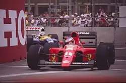 In 1994, the Ferrari was far more competitive, but marred by unreliability, and team-mate Berger became established as the team leader. After finishing third in the first race of the season, Alesi injured his back after a testing accident at Mugello circuit in Italy after the first race of the 1994 season (Brazil) and was replaced in the Pacific Grand Prix and the San Marino Grand Prix by Nicola Larini.[20] He returned with a fifth place in Monaco and finished a strong third in Canada, but almost lost the position at the end of the race due to a gearbox problem.[21] He retired in the French Grand Prix due to a collision with Rubens Barrichello, but finished second in the British Grand Prix, thanks to the disqualification of Michael Schumacher, and was looking set for a strong result in the German Grand Prix, qualifying second behind team-mate Berger, but his engine failed on the first lap. Subsequent races were marked by a series of retirements. At Monza, he took his first pole position and led until his first pit stop, when his gearbox failed in the pitlane, and in anger, he drove back to Avignon at speeds in excess of 200 km/h.[22] This streak finally ended at Japan, when he finished third after a duel with Nigel Mansell's Williams, and then he finished sixth at Australia. Alesi finished fifth in the championship with 24 points.