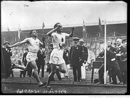 Alexandre François Étienne Jean Bouin (French: [bwɛ̃]; 21 December 1888 – 29 September 1914) was a French middle-distance runner. He competed in the 1500m at the 1908 Olympics and the 5000m at the 1912 Olympics. He won a silver medal in the 5000m in 1912, behind Hannes Kolehmainen.[2] His race against Kolehmainen has long been regarded as one of the most memorable moments in running. Kolehmainen and Bouin quickly pulled away from the others, with Bouin leading and Kolehmainen repeatedly trying to pass him. Kolehmainen succeeded only 20 metres from the finish, winning by 0.1 seconds. Both contenders broke the previous world record.[3][4]
