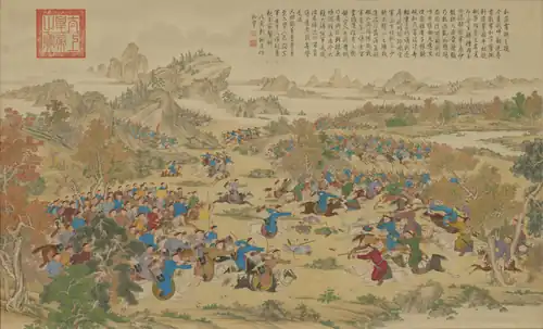 After successful military campaigns in Central Asia, the Qianlong Emperor commissioned depictions of the battles. The work was carried out by four Jesuit artists, among them Attiret. The group produced 16 tableaux, which were engraved in France in 1774, six years after Attiret's death in Beijing.