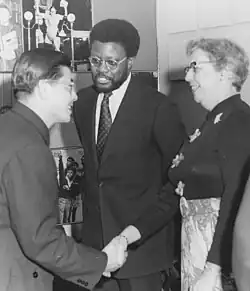 ![]() Lowrie (right) shaking hands with Fu Feng-Kuei, an instructor at Peking Foreign Language Institute, alongside Robert Wedgeworth, Director of the ALA, during a visit by Chinese librarians to the ALA headquarters. October 18, 1973 | |