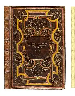 Grolier was particularly interested in the Latin classics, and his books were bound in different coloured leather according to subject matter. His first period in Italy already shows him taking an innovative interest in bookbinding, commissioning a series of "plaquette bindings" with large medal-like reliefs at the centre of the cover. Previously this style had only been used for special presentation volumes, and Grolier was the first collector to apply it systematically to books for his own library, which he seems to have begun to do in 1510.[11] Most of his library was bound in France, but the designs continued to show Italian influence. Grolier gave his name to a style of bookbinding ornamented with geometric patterns, exemplified in those he commissioned, and perhaps helped to design.[12] Grolier bindings were mostly produced in Paris between 1520 and 1555, and show a development in style: "Simple geometrical strapwork designs with fleurons at the corners of the central panel developed in the later bindings into elaborate curvilinear interlacings combined with arabesques sometimes enclosed in roll-produced borders".[13]