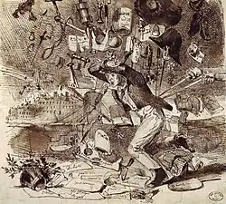Before La Silhouette closed, Charles Philipon and Auguste Audibert founded La Caricature in 1830, with Honoré de Balzac as a literary editor and Grandville, Achille Devéria, Honoré Daumier, Edme Jean Pigal, Auguste Raffet, and Charles-Joseph Traviès de Villers as cartoonist and lithographers.[8] As one author put it "From 1830 to 1835 Philipon and La Caricature waged all-out war against Louis-Philippe."[1] As part of this "war" Grandville designed numerous prints, including multi-part lithographs published over a period of weeks that collectors could piece together into one, e.g. the seven part Grande Croisade contre la Liberté (The Great Crusade Against Liberty) and La Chasse à la Liberté (The Hunters in Pursuit of Liberty). These attacks on monarchy were taken seriously and were not without consequences. Louis Philippe's regime seized papers, levied fines, and sent editors, writers, and illustrators to prison. Daumier was fined 500 francs and spent six months in prison in 1832. Charles Philipon received even greater fines and longer prison terms as did other publishers. Grandville endured persistent harassment from the police, including searches, and one incident described as a mugging in his own building by thuggish policemen, foiled by a neighbor who confronted them with pistols. He is said to have been deeply distressed by these events. Grandville filed criminal charges asserting the police had entered his residence by force, and he later published a lithograph Oh!! Les vilaines mouches!!(Oh!! These nasty flies!! ) Philipon organized L'Association Mensuelle lithographique which offered fine prints to its members in the early 1830s. Grandville produced over half the prints, with the profits going to pay the paper's fines.[1][5]