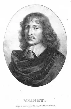 Mairet was one of the bitterest assailants of Corneille in the controversy over the violation of the classical unities in Corneille's play Le Cid.[1] He produced several pamphlets against Corneille, who responded more than once, most famously with his Advertissement au Besançonnois Mairet (1637). The personal intervention of Cardinal Richelieu was eventually required to calm the furore in the theatres. It was perhaps his jealousy of the successful Corneille, together with the deaths of his aristocratic patrons, first the duc de Montmorency (1632) and then François de Faudoas, comte de Belin, that made Mairet give up writing for the stage.[1]