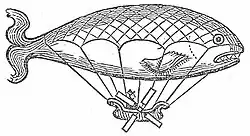 A large building (30 metres in length) with the gates opening from the floor to the roof was built near Hyde Park; this was probably the first hangar in the history of aviation. Seamstresses were hired to sew the outer fish-shaped shell of the hydrogen-filled airship in sevenfold layers from the dried intestines of 70,000 oxen; a second, spherical balloon would provide pressure equalization inside the fish. The 10 metre tailfin serving as the helm was made of silk and whalebone, as were the rudders on the left and right. As for the drive, Pauly had learned from his Paris flights that muscle power alone was not enough, so new to his plans was the lightest possible steam engine.[12]