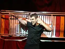 Las Vegas Review-Journal's Mike Weatherford in a June 2012 review called Civillico's early act in the show "one of the most memorable bits".[41] Civillico selects two male volunteers from the audience ("two strong beasts of men")[24] to assist him to mount his unicycle.[41] Weatherford described the act as the "dudes (and it would only work with guys) become uncomfortably familiar with both the front and back of Civillico's crotch, before they all help each other mouth-catch marshmallows". Weatherford was awed at Civillico's "agility as well as the speed of ad-lib". After a marshmallow ricocheted off the stage, an audience member grabbed it and flung it into Civillico's jaws. Civillico said, "You just got his DVD", and gave the audience member the DVD present that was originally going to be given to the fumbling volunteer.[41]