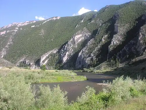 The middle Jefferson enters a narrow canyon a short distance downstream from Cardwell and is largely contained by the geography for most of the next 15 miles downstream to Sappington Bridge. Lacking the ability to flood or meander, this section of the river has few trees, swamps, meadows, and significantly less wildlife than the upper Jefferson.[19]
