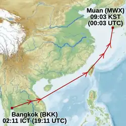 In the 48 hours leading to the crash, the aircraft made 13 flights that included stops in Muan, Jeju Island, and Incheon, as well as to Beijing, Bangkok, Kota Kinabalu, Nagasaki, and Taipei.[9] No issues were found in the aircraft's safety pre-check before its final flight, according to Jeju Air.[10]