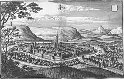 In the 13th century, the Lords of Lobdeburg founded two towns in the valley: Jena on the west bank and Lobeda – which is one of Jena's constituent communities today – 4 km (2 mi) to the south on the east bank. Around 1230, Jena received town rights and a regular city grid was established between today's Fürstengraben, Löbdergraben, Teichgraben and Leutragraben. The city got a marketplace, main church, town hall, council and city walls during the late 13th and early 14th centuries making it into a full-fledged town. In this time, the city's economy was based mainly on wine production on the warm and sunny hillsides of the Saale valley. The two monasteries of the Dominicans (1286) and the Cistercians (1301) rounded out Jena's medieval appearance.
