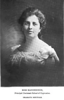 Mannheimer was director of the drama department at the Cincinnati College of Music from 1900 until 1907. She also ran her own school, the Cincinnati School of Expression (1894-1912).[6] In 1914, she went traveling in Europe with her brother, only to encounter difficulty as the First World War began. Her letters home to Cincinnati were quoted in the newspaper as first-hand accounts of the volatile situation.[7]