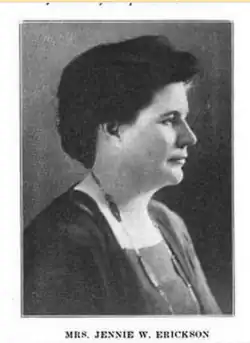Jennie W. Erickson was chief probation officer of the juvenile court of Pulaski County, Arkansas from 1917 to 1920, in charge of mother's pensions and the county's juvenile detention home in Little Rock.[2] She went to Washington to secure federal funding for a girls' reformatory in Arkansas.[3][4] Her work, focused on training programs, aesthetic and social supports, was publicized nationally as an example of progressive policy towards deliquency, dependency, and truancy.[1][5]
