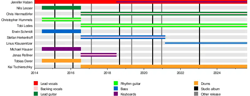 On July 15, 2016, the band announced that Jennifer Haben and her musicians were parting ways. Haben continued the band with new members.[14] The new band line-up (Kai Tschierschky (drums), Tobi Lodes (rhythm guitar), Chris Hermsdörfer (lead guitar), Stefan Herkenhoff (bass) and Jonas Roßner (keyboards)) was announced in November 2016 and organized as a permanent-member band from this time on.