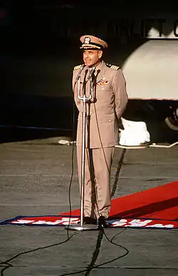 Navy Captain Jeremiah Denton at Clark Air Base, Philippines, shortly after his release as a POW in Hanoi, in February 1973.