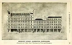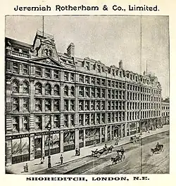 In 1898 the four partners put the store up for sale for £500,000 via a stock market flotation. They agreed to stay on as directors to ensure a continuity of business arrangements and to liaise with stakeholders. At the time of Rotherham's death, several of the buildings in Shoreditch High Street appear to have been leased,[16] however by the time of the sale the company's property portfolio was said to be mostly freehold, including the main store in Shoreditch High Street, numbers 80, 81, 82, 83, 84, 85, 86, 87, 88, 89, 90 and 91, plus the building to the rear in Boundary Street, numbers 17, 19, 21, 23, 25, 31, 33 and 35.[17] There is no mention in the prospectus of Rotherham's niece and nephew being involved in the sale of the store, so it appears that their interest in the business had been sold to the partners. Similar stock market flotation of privately owned department stores at this time included Harrods in 1889, William Whiteley (Universal Provider) in 1899 and D. H. Evans & Co in 1894. These stores were able to raise funding on the stock market for expansion and to purchase other smaller stores, for example Harrods purchased Dickins & Jones in 1914.[18] The application for shares in Jeremiah Rotherham & Co. was heavily oversubscribed and about two years later a further sale of debenture and ordinary shares was offered.[19] The dividend paid to shareholders for many years was between five and seven percent.[20]