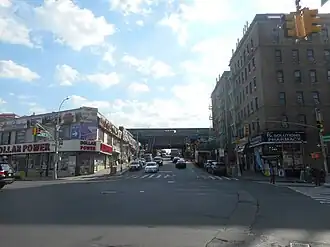 ![]() Jerome Avenue at 167th Street. The subway station up the road is one block east over River Avenue. | |