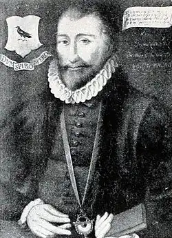 Jerome Corbet died in 1598 and was buried in the family chapel at Moreton Corbet parish church on 30 July.[1] There is no memorial but an apparently contemporary portrait survives. He is shown dressed in contemporary fashion, with a Latin motto in the top left corner of the painting: Dum spiro spero – While I still breathe, I hope.