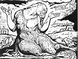 Jerusalem: The Emanation of the Giant Albion (1804–1820, with additions made even later) is a prophetic book by English poet William Blake. Jerusalem is the last, longest and greatest in scope of Blake's works. Etched in handwriting, accompanied by small sketches, marginal figures and huge full-plate illustrations, it has been described as "visionary theatre". The poet himself believed it was his masterpiece and it has been said that "of all Blake's illuminated epics, this is by far the most public and accessible".[2] Nonetheless, only six copies were printed in Blake's lifetime and the book, like all of Blake's prophetic works, was all but ignored by his contemporaries.