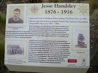During the expedition, he was chosen by Scott as a member of an elite support party for Scott's Southern trip.[2] Handsley served for the full duration of the expedition, but the ship was trapped in ice for most of that time. He undertook several sledging trips whilst on the journey, spending a total of 153 days man-hauling sledges.[3]
