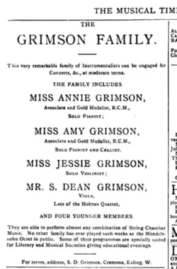 Their debut concert took place in January 1896.[1] Sometimes appearing as an eight-piece, members of the family also performed as a quartet or trio, as well as with other musicians.[1] Jessie Grimson also performed as a soloist, including at the South Place Sunday Concerts, and other venues across London.[1] She was praised as an "intelligent and painstaking artist", who could perform with "suavity and fluency".[1] Between 1887 and 1927, Grimson performed in the concerts at South Place 105 times.[2]