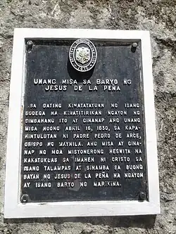The construction of Jesús de la Peña Chapel marks the beginning of Christianity in Marikina. Before the Spaniards arrived, the area was settled by river-dwellers who relied on the Marikina River for their means of livelihood. When the Jesuits first came to the idyllic, fertile land now known as Jesús dela Peña, they brought with them a small image of Jesus. Fired with zeal to convert the natives to Catholicism, they held the first Mass in a former storage house on April 16, 1630. Afterwards, they immediately formed their order at the west bank of the river, which was full of big rocks. Inspired by the site, the priests soon called the place as "Jesús de la Peña" (Jesus of the Rock) which was also the name of the new mission.[3]
