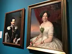 Non-royal portraits also lined the walls. These were court ball attendees wearing the style of nearby clothing and accessories on display. For example, the portraits of Arkady Telyakovsky and his wife Julia Kanshina show how the clothing and accessories were worn in the mid-19th century. Arkady is wearing a dress uniform with silver buttons and silver epaulets. On his chest can be seen several military honors. Julia carries a porte-bouquet and wears several bracelets at once, and one of them has a miniature portrait of her husband.