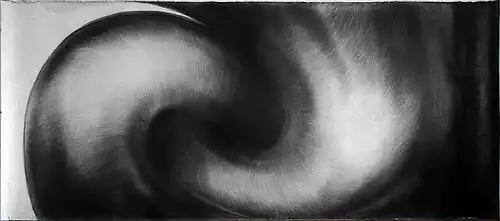 This shape also offers the possibility of mathematical transformation, during which the whole object can be turned inside out through eversion (like From nowhere to nowhere, 1990–1997), to work in a 4D space and to decrease the central space through shortening of the axis, leading to final degeneration into a sphere. (It, charcoal on cardboard, 220 x 480 cm, 1989–92).