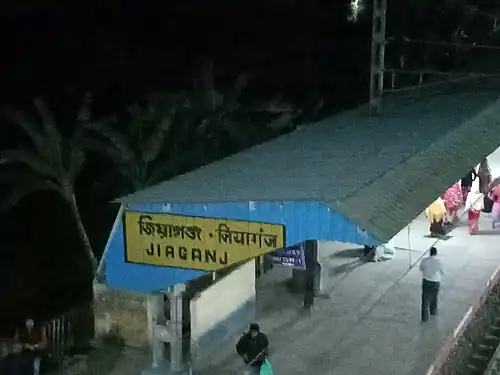 Jiaganj is a railway station of the Sealdah-Lalgola line in the Eastern Railway zone of Indian Railways. The station is situated at Jiaganj in Murshidabad district in the Indian state of West Bengal. It serves Jiaganj town and surroundings areas.[1] Distance between Sealdah and Jiaganj is 204 km.[2] Bhagirathi Express, Hazarduari Express, Dhano Dhanye Express, Lalgola Passengers and few EMU trains pass through the station.[3]