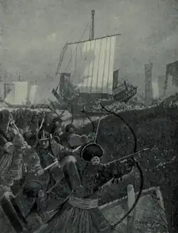 The term "wokou" literally means "dwarf pirates", with "wo" (倭; "dwarf") being the Classical Chinese pejorative for the Japanese people.[5] The term was first used to refer to Japanese invaders on the Gwanggaeto Stele in 414 AD,[6] and was reused in 1223 when Japanese pirates raided the Korean coast.[7] These pirates eventually broadened their area of operations to the coast of China, and were active throughout East Asian coasts up to the establishment of the Ming dynasty in China.[7] However, by the 16th century, the pirates nominally called the "wokou" were mostly not Japanese, but actually Chinese. According to the History of Ming and other contemporary Chinese records, only thirty percent of the 16th century wokou were Japanese, while seventy percent were ethnic Chinese.[8] Moreover, the Chinese played the leading role in these later wokou raids, with the Japanese and those of other nationalities being mere associates and hired hands.[9]