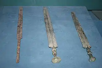 Among the Terracotta warriors in the tomb of Qin Shi Huang, figures representing officers were originally armed with jian made from an alloy of copper, tin, and other elements including nickel, magnesium, and cobalt. Several double-edged bronze swords have been recovered by modern archaeologists, but most were stolen centuries ago along with the polearms and bows of the enlisted men.[13]