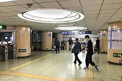 Jianguomen Station[1] (simplified Chinese: 建国门站; traditional Chinese: 建國門站; pinyin: Jiànguómén Zhàn) is an interchange station on Line 1 and Line 2 of the Beijing Subway at Jianguomen in Dongcheng District and Chaoyang District, Beijing.[2] The station handles over 170,000 transfers between Lines 1 and 2 per day.[3]
