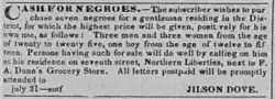 Jilson Dove (c. 1785 – June 14, 1853) was a resident of Washington, D.C. in the United States. He worked at a number of occupations including federal police officer guarding Native American delegations visiting the city, municipal constable, fishmonger, restauranteur, real estate agent, and slave trader. In the 1830s he caught the attention of abolitionists, in part due to his work as a local slave patroller. Dove would probably have been considered a slave-trading agent, meaning a second-tier trader who primarily concentrated on local, small-scale buying for resale to the larger interstate slave dealers.