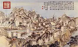 The Jinchuan campaigns (Chinese: 大小金川之役), also known as the Suppression of the Jinchuan Hill Peoples (Chinese: 平定兩金川), were two wars between Qing Empire and the rebel forces of Gyalrong chieftains ("Tusi") from the Jinchuan region. The first campaign against Chiefdom of Chuchen (Da Jinchuan or Greater Jinchuan in Chinese) happened in 1747 when the Tusi of Greater Jinchuan Slob Dpon attacked the Chiefdom of Chakla (Mingzheng). The Qianlong Emperor decided to mobilize forces and suppress Slob Dpon, who surrendered to the central government in 1749. The second campaign against Chiefdom of Tsanlha (Xiao Jinchuan or Lesser Jinchuan) took place in 1771, when the Jinchuan Tusi Sonom killed Geshitsa Tusi of Ngawa County in Sichuan Province. After Sonom killed Geshitsa Tusi, he helped Tusi of Lesser Jinchuan, Skal bzang, to occupy the lands belonging to the other Tusi in the region. The provincial government ordered Sonom to return lands and accept the trial at the Ministry of Justice immediately. Sonom refused to retreat his rebels. The Qianlong Emperor was furious and gathered 80,000 troops and entered Jinchuan. In 1776, Qing troops sieged the castle of Sonom to force his surrender.[1]